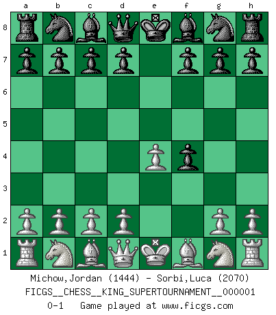 Last move : 0-1 2018 February 18 2:26:15 [Event "FICGS__CHESS__KING_SUPERTOURNAMENT__000001"] [Site "FICGS"] [Date "2018.01.18"] [Round "1"] [White "Michow,Jordan"] [Black "Sorbi,Luca"] [Result "0-1"] [WhiteElo "1444"] [BlackElo "2070"] 1.e4 e5 2.f4 exf4 0-1 This chess game has been lost on time (started : 2018.01.18 21:28:44) King's gambit accepted Player Black won this chess game. Follow this game move after move (download)First-class players lose to second class players because second-class players sometimes play a first-class game. (Tarrasch) Ich verstehe den Grund nicht, warum die Aufteilung in Frauen und Männer überhaupt im Schach besteht. (Judith Polgar) Los tropiezos estan todos ahí en el tablero, esperando que se cometan. (Savielly Tartakover) Si je n'étais pas joueur d'échecs, je serais le meilleur dans quelque chose d'autre. (Anatoli Karpov) You can think I'm wrong, but that's no reason to quit thinking. (Gregory House, House M.D.)