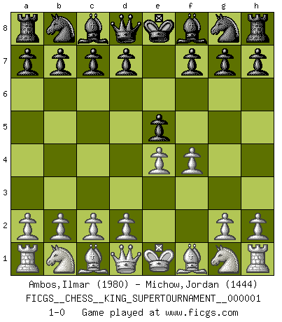 Last move : 1-0 2018 February 18 2:26:15 [Event "FICGS__CHESS__KING_SUPERTOURNAMENT__000001"] [Site "FICGS"] [Date "2018.01.18"] [Round "1"] [White "Ambos,Ilmar"] [Black "Michow,Jordan"] [Result "1-0"] [WhiteElo "1980"] [BlackElo "1444"] 1.e4 e5 2.f4 1-0 This chess game has been lost on time (started : 2018.01.18 21:28:44) King's gambit Player White won this chess game. Follow this game move after move (download)When you play Bobby, it is not a question if you win or lose. It is a question if you survive. (Boris Spassky) Der Freibauer hat für mich eine Seele, genau wie der Mensch, Wünsche, die unerkannt in ihm schlummern, und Befürchtungen, von deren Existenz er selbst kaum ahnt. (Aaron Nimzowitsch) Cuando estes solo, cuando te sientas un extraño en el mundo, juega al Ajedrez. Esto levantará tu espiritu y será tu consejero de guerra. (Aristóteles) Il (Jacob Murray) ne joue pas pour le bon coup, mais pour le meilleur. (Eloi Relange) Two beer, or not two beer. (Unknown)