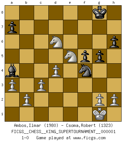 Last move : 1-0 2018 February 13 0:17:17 [Event "FICGS__CHESS__KING_SUPERTOURNAMENT__000001"] [Site "FICGS"] [Date "2018.01.18"] [Round "1"] [White "Ambos,Ilmar"] [Black "Csoma,Robert"] [Result "1-0"] [WhiteElo "1980"] [BlackElo "1323"] 1.e4 e5 2.f4 exf4 3.Nf3 d6 4.d4 Nf6 5.Nc3 Be7 6.Bxf4 O-O 7.Bc4 Nxe4 8.Nxe4 d5 9.Bxd5 Qxd5 10.Qd3 Bf5 11.Nfd2 Nc6 12.c3 Rfe8 13.O-O Bf8 14.Rae1 Re7 15.Rf2 Rae8 16.Rfe2 Bg4 17.Re3 f5 18.Nf2 Bh5 19.Rxe7 Rxe7 20.Rxe7 Bxe7 21.Bxc7 Qd7 22.Bf4 Bf6 23.Nh3 Ne7 24.Bg5 Bxg5 25.Nxg5 h6 26.Ngf3 Nd5 27.Ne5 Qc8 28.a3 Nf4 29.Qb5 Be8 30.Qc4+ Qxc4 31.Ndxc4 Bb5 32.Nd6 Ba4 33.Nxb7 g5 34.Nd6 1-0 KGA : Fischer defense Kingside Castling by player Black (move 6) Kingside Castling by player White (move 13) Player White won this chess game. Follow this game move after move (download)Chess, like love, is infectious at any age. (Flohr) Kostenjuk hat keinen Sexappeal. (Loek van Wely) No hay otro maestro que tenga una voluntad terrífica de ganar. Al tablero, el irradía peligro y aún los oponentes mas fuertes tienden a congelarse como liebres cuando olfatean a una pantera. Aún sus debilidades son peligrosas. Con las blancas, su juego de apertura es predecible - te es posible hacer planes en su contra - pero es tan fuerte que tus planes casi nunca funcionan. En el juego medio, su precisión e invención son fabulosas y en finales, tú simplemente no le puedes vencer. (Experto Alemán anónimo) Le jeu d'échecs fait naître et fortifie en nous plusieurs qualités précieuses dans le cours de l'existence, telles que la prévoyance, la circonspection, la prudence, et la persévérance. (Benjamin Franklin - 1783, la morale des échecs) Secret operations are essential in war; upon them the army relies to make its every move. (Sun Tzu)