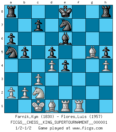 Last move : 1/2-1/2 2018 January 29 11:2:20 [Event "FICGS__CHESS__KING_SUPERTOURNAMENT__000001"] [Site "FICGS"] [Date "2018.01.18"] [Round "1"] [White "Farnik,Kym"] [Black "Flores,Luis"] [Result "1/2-1/2"] [WhiteElo "1830"] [BlackElo "1957"] 1.e4 e5 2.f4 exf4 3.Nf3 g5 4.Bc4 Bg7 5.d4 d6 6.h4 h6 7.Qd3 g4 8.Ng1 Qf6 9.c3 h5 10.Na3 Bh6 11.Bd2 a6 12.O-O-O Ne7 13.Ne2 f3 14.gxf3 b5 15.Bb3 Qxf3 16.Qxf3 gxf3 17.Ng1 f5 18.Nxf3 fxe4 19.Ng5 Bxg5 20.Bxg5 Nbc6 21.Rde1 d5 22.Rhf1 Na5 23.Bd1 Be6 24.Nc2 1/2-1/2 Kym Farnik Thanks for the game, Qs off - dead as King's knight's gambit Queenside Castling by player White (move 12) This chess game ended in a draw. Follow this game move after move (download)The tactician must know what to do whenever something needs doing; the strategist must know what to do when nothing needs doing. (Savielly Tartakover) Alles was am Schachbrett zählt sind gute Züge. (Robert James Fischer) Tu no necesitas jugar muy bien, únicamente ayudar a tu oponenet a que juegue muy mal. (Genrikh Chepukaitis) Plusieurs personnes se sont demandées comment Tal faisait pour gagner... En fait, c'est très simple ! Il met ses pièces au centre de l'échiquier et les sacrifie quelque part ! (David Bronstein) The leaves of memory seemed to make a mournful rustling in the dark. (Henry Wadsworth Longfellow)