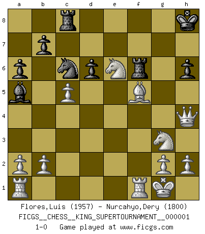 Last move : 1-0 2018 February 9 3:29:33 [Event "FICGS__CHESS__KING_SUPERTOURNAMENT__000001"] [Site "FICGS"] [Date "2018.01.18"] [Round "1"] [White "Flores,Luis"] [Black "Nurcahyo,Dery"] [Result "1-0"] [WhiteElo "1957"] [BlackElo "1800"] 1.e4 e5 2.f4 Qf6 3.Nc3 Qxf4 4.d4 Be7 5.Bxf4 exf4 6.Nf3 d6 7.Nd5 Bd8 8.Nxf4 Nf6 9.Bd3 h6 10.O-O g5 11.Ne2 O-O 12.Ng3 Nc6 13.c3 a6 14.e5 Nd5 15.Qd2 Be6 16.c4 Nde7 17.exd6 cxd6 18.d5 Rc8 19.dxe6 fxe6 20.Nxg5 Nf5 21.Nxe6 Bb6+ 22.c5 Ba5 23.Qf4 Rf6 24.Bxf5 Kh8 25.Qh4 1-0 KGD : Norwalde variation Kingside Castling by player White (move 10) Kingside Castling by player Black (move 11) Player White won this chess game. Follow this game move after move (download)As one by one I mowed them down, my superiority soon became apparent. (Jose Capablanca) Kein Schachspieler kann gut schlafen. (H. G. Wells) En la vida, como en el Ajedrez, los Peones propios obstruyen nuestro camino. La gran fortuna de un hombre, su comodidad, placer, hijos, libros, que deberían ayudarle a ganar, con mucha frecuencia lo ponen en Jaque Mate. (Charles Buxton) Les échecs sont un jeu terrible. Si vous n'avez pas le centre, votre adversaire a une position plus libre. Par contre, si vous avez le centre, alors vous avez vraiment quelque chose pour laquelle vous inquiéter ! (Siegbert Tarrasch) Warrior pose battles inner weakness and wins focus. You see that there is no war within you. You're on your own side, and you are your own strength. (Terri Guillemets)