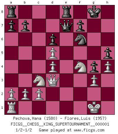 Last move : 1/2-1/2 2018 April 16 0:1:18 [Event "FICGS__CHESS__KING_SUPERTOURNAMENT__000001"] [Site "FICGS"] [Date "2018.01.18"] [Round "1"] [White "Pechova,Hana"] [Black "Flores,Luis"] [Result "1/2-1/2"] [WhiteElo "1580"] [BlackElo "1957"] 1.e4 e5 2.f4 exf4 3.Nf3 g5 4.h4 g4 5.Ne5 Nf6 6.Bc4 d5 7.exd5 Bd6 8.d4 Nh5 9.O-O O-O 10.Rxf4 Nxf4 11.Bxf4 Bf5 12.g3 Nd7 13.Nc3 Re8 14.Bd3 Bxd3 15.Nxd3 h5 16.Bxd6 cxd6 17.Nf4 Nf6 18.Qd3 Qe7 1/2-1/2 KGA : Kieseritsky, Berlin defense, 6.Bc4 Kingside Castling by player White (move 9) Kingside Castling by player Black (move 9) This chess game ended in a draw. Follow this game move after move (download)War is the child of passion, passion is the child of narcissism and narcissism is the child. (...) Another game ? (Thibault de Vassal) Die Elozahlen sind sehr schlecht für das Schach. Jetzt ist Schach eine Sportindustrie, die darauf zielt Elopunkte zu machen. (Miguel Najdorf) Yo creo que el Ajedrez posee una magia que es también una ayuda en la edad avanzada. Una rodilla reumática es olvidada durante una partida de Ajedrez y otros eventos pueden parecer algo sin importancia comparada a una catástrofe en el tablero de Ajedrez. (Vlastimil Hort) L'attaque fait le spectacle, la défense gagne les matchs. (Dicton footballistique) History is a gallery of pictures in which there are few originals and many copies. (Alexis de Tocqueville)