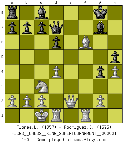 Last move : 1-0 2018 February 6 0:19:20 [Event "FICGS__CHESS__KING_SUPERTOURNAMENT__000001"] [Site "FICGS"] [Date "2018.01.18"] [Round "1"] [White "Flores,Luis"] [Black "Rodriguez,Juan Antonio"] [Result "1-0"] [WhiteElo "1957"] [BlackElo "1575"] 1.e4 e5 2.f4 exf4 3.Nf3 g5 4.h4 g4 5.Ne5 h5 6.Bc4 Rh7 7.d4 d6 8.Nxf7 Rxf7 9.Bxf7+ Kxf7 10.Bxf4 Nf6 11.Nc3 Bg7 12.Qe2 Kg8 13.O-O-O Nbd7 14.e5 Ne8 15.Bg5 Ndf6 16.Rhf1 Qd7 17.exf6 Nxf6 18.Bxf6 1-0 KGA : Kieseritsky, long whip (Stockwhip, Classical) defense Queenside Castling by player White (move 13) Player White won this chess game. Follow this game move after move (download)I'm not afraid of Spassky. The world knows I'm the best. You don't need a match to prove it. (Bobby Fischer) Sicherlich können nur Meister einen Stil haben. Daß ein nicht-Meister auch nur ein einziges Mal in seinem Leben eine Partie folgerecht durchführte, habe ich niemals bemerkt. (Emanuel Lasker) Los problemas de Ajedrez exigen del compositor las mismas virtudes que caracterizan todo el arte de valor: originalidad, invención, concisión, armonía, complejidad e insinceridad explendida. (Vladimir Nabokov) Les réformistes prétendent que les progrès de la théorie conduiront à la disparition des échecs, et qu'il faut, pour leur rendre vie, en remanier les règles. En réalité, qu'exprime cette affirmation? Le mépris de l'intuition, de l'imagination et de tous les autres éléments qui font des échecs un art. (Alexander Alekhine) The only thing that overcomes hard luck is hard work. (Harry Golden)