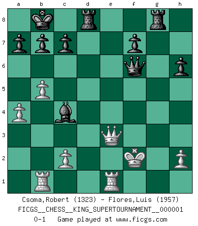 Last move : 0-1 2018 February 9 22:41:45 [Event "FICGS__CHESS__KING_SUPERTOURNAMENT__000001"] [Site "FICGS"] [Date "2018.01.18"] [Round "1"] [White "Csoma,Robert"] [Black "Flores,Luis"] [Result "0-1"] [WhiteElo "1323"] [BlackElo "1957"] 1.e4 e5 2.f4 exf4 3.Nf3 g5 4.Bc4 Bg7 5.O-O d6 6.d4 h6 7.Nc3 Nc6 8.Re1 g4 9.d5 gxf3 10.dxc6 Qg5 11.Qxf3 Qc5+ 12.Kh1 Qxc4 13.Bxf4 Qxc6 14.Bd2 Be6 15.Rad1 O-O-O 16.Rb1 Ne7 17.b4 Kb8 18.b5 Qc5 19.a4 d5 20.Nxd5 Nxd5 21.exd5 Bxd5 22.Qg3 Rhg8 23.Be3 Bd4 24.Bxd4 Qxd4 25.Qe3 Bxg2+ 26.Kg1 Bd5 27.Kf1 Bc4+ 28.Kf2 Qf6+ 0-1 KGA : Hanstein gambit Kingside Castling by player White (move 5) Queenside Castling by player Black (move 15) Player Black won this chess game. Follow this game move after move (download)I like to say that Bobby Fischer was the greatest player ever. But what made Fischer a genius was his ability to blend an American freshness and pragmatism with Russian ideas about strategy. (Bruce Pandolfini) Obwohl ich vom Stil her kaum zu den Priestern der Schachkunst gezählt werde, halte ich Schach doch für eine Kunst. (Tigran Petrosjan) Nunca nadie ha ganado una partida de Ajedrez rindiendose. (Unknown) Des idées, des idées, j'en ai cent, j'en ai mille. Des bonnes, des mauvaises, applicables, irréalisables... Il suffit de faire le tri ! (Roos) All men can see these tactics whereby I conquer, but what none can see is the strategy out of which victory is evolved. (Sun Tzu)