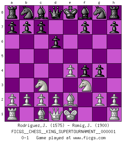 Last move : 0-1 2018 January 22 17:29:39 [Event "FICGS__CHESS__KING_SUPERTOURNAMENT__000001"] [Site "FICGS"] [Date "2018.01.18"] [Round "1"] [White "Rodriguez,Juan Antonio"] [Black "Romig,James"] [Result "0-1"] [WhiteElo "1575"] [BlackElo "1900"] 1.e4 e5 2.f4 exf4 3.Nf3 d6 4.Nc3 g5 5.Be2 g4 0-1 KGA : Fischer defense Player Black won this chess game. Follow this game move after move (download)Winning isn't everything... but losing is nothing. (Mednis) Schach ist ein Kampf gegen den Fehler. (Johannes Herrman Zukertort) Es muy difícil jugar en contra de la teoría de Einstein. - en su primera derrota en contra de Fischer (Mikhail Tal) Il n'y a plus de joueurs du niveau de Jacob Murray dont la seule quête est le beau jeu, le plaisir de voir les pièces construire quelque chose. Sur 10 idées à la minute, 9 seront sans intérêt, la dernière s'avèrera géniale. (Christian Bauer) It is not titles that honor men, but men that honor titles. (Niccolo Machiavelli)