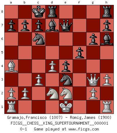 Last move : 0-1 2018 March 2 21:4:25 [Event "FICGS__CHESS__KING_SUPERTOURNAMENT__000001"] [Site "FICGS"] [Date "2018.01.18"] [Round "1"] [White "Gramajo,Francisco"] [Black "Romig,James"] [Result "0-1"] [WhiteElo "1007"] [BlackElo "1900"] 1.e4 e5 2.f4 exf4 3.Qf3 Nf6 4.Qxf4 Nc6 5.c3 Qe7 6.d3 d5 7.Be3 dxe4 8.d4 g6 9.Bb5 Ng4 10.h3 Bh6 11.Qg3 Nxe3 12.Ba4 Bd7 13.Nd2 O-O-O 14.Ne2 f5 0-1 KGA : Breyer gambit Queenside Castling by player Black (move 13) Player Black won this chess game. Follow this game move after move (download)The passed Pawn is a criminal, who should be kept under lock and key. Mild measures, such as police surveillance, are not sufficient. (Aaron Nimzovich) Kleine Schachspieler machen Mist, und große Schachspieler machen Mist, aber große machen weniger Mist. (Fritz Sämisch) Haz el enroque temprano y seguido. (Rob Sillars) Le joueur d'Echecs qui veut atteindre le top est obligé de développer son propre credo créatif. Alexeï Stepanovicth Souétine. Il est facile d'écrire des livres ! Ce qui est difficile, c'est de jouer ! (Alexeï Stepanovicth Souétine) A government big enough to give you everything you want is strong enough to take everything you have. (Thomas Jefferson)