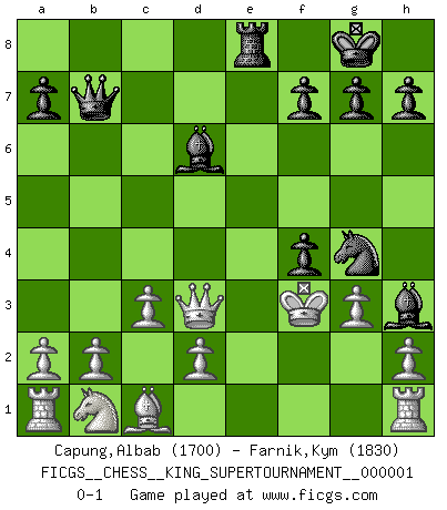 Last move : 0-1 2018 January 24 6:21:9 [Event "FICGS__CHESS__KING_SUPERTOURNAMENT__000001"] [Site "FICGS"] [Date "2018.01.18"] [Round "1"] [White "Capung,Albab"] [Black "Farnik,Kym"] [Result "0-1"] [WhiteElo "1700"] [BlackElo "1830"] 1.e4 e5 2.f4 exf4 3.Nf3 d5 4.exd5 Nf6 5.Bb5+ c6 6.dxc6 Nxc6 7.c3 Bd6 8.Qe2+ Be6 9.Nd4 O-O 10.Nxc6 bxc6 11.Bxc6 Bg4 12.Qd3 Qe7+ 13.Kf1 Rae8 14.Bxe8 Rxe8 15.g3 Bh3+ 16.Kf2 Ng4+ 17.Kf3 Qb7+ 0-1 Kym Farnik Thanks for the game KGA : Abbazia defense, Modern variation Kingside Castling by player Black (move 9) Player Black won this chess game. Follow this game move after move (download)I have added these principles to the law: get the Knights into action before both Bishops are developed. (Emanuel Lasker) Die Leute spielen gegen mich seit 15 Jahren unter Ihren Möglichkeiten. (Robert James Fischer) La última cosa en que Fischer estaba interesado era en tonterías, siempre y cuando el Ajedrez estuviera involucrado. (Elie Agur) Même si vous avez un bon coup à faire, regardez toujours s'il n'y en a pas un qui lui soit préférable. (Pedro Damiano) For peace of mind, resign as general manager of the universe. (Douglas Adams)