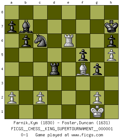 Last move : 0-1 2018 March 10 13:24:9 [Event "FICGS__CHESS__KING_SUPERTOURNAMENT__000001"] [Site "FICGS"] [Date "2018.01.18"] [Round "1"] [White "Farnik,Kym"] [Black "Foster,Duncan"] [Result "0-1"] [WhiteElo "1830"] [BlackElo "1631"] 1.e4 e5 2.f4 exf4 3.Nf3 d6 4.d4 g5 5.h4 g4 6.Ng1 Bh6 7.Nc3 c6 8.Nge2 Qf6 9.e5 dxe5 10.Ne4 Qg6 11.N2c3 f5 12.Ng5 exd4 13.Bxf4 dxc3 14.Bc4 cxb2 15.Rb1 Bxg5 16.Bxg5 Ne7 17.O-O Nd5 18.Bxd5 cxd5 19.Qxd5 Nc6 20.Rbe1+ Kf8 21.Qc5+ Kf7 22.Qc4+ Kf8 23.Qb3 h6 24.Qxb2 Rh7 25.Qa3+ Kg8 26.Qb3+ Rf7 27.Re8+ Kh7 28.Bf4 b6 29.Rfe1 Qg7 30.h5 Bb7 31.R8e6 Rf6 32.Rxf6 Qxf6 33.Re6 Qd4+ 34.Qe3 Rd8 35.Qxd4 Rxd4 0-1 Comment by player 1 : Kym Farnik : 16.- Ne7 Draw offered Hmmm... no. Qs still on and too much activity for white! Ok, White a piece and pawns down, but black K is naked in the center, white 2 bishops are slicing black position, black Q side is undeveloped, open lines for white rooks to center/black King. KGA : Fischer defense Kingside Castling by player White (move 17) Player Black won this chess game. Follow this game move after move (download)Look at Garry Kasparov. After he loses, invariably he wins the next game. He just kills the next guy. That's something that we have to learn to be able to do. (Maurice Ashley) Der 70jährige Viktor Kortschnoi: Die Rentenanstalt wollte mich zwingen in Rente zu gehen. Meine Frau erhält jetzt eine Pension- und ich zahle weiter in die Rentenkasse ein! (Viktor Kortschnoi) En el Ajedrez, tal como es jugado por los Maestros, practicamente la suerte es eliminada. (Emanuel Lasker) Le plus grand jeu de l'esprit jamais inventé, plus vous l'apprenez, plus vous y prenez du plaisir. (Garry Kasparov) At last I discovered the true beauty of chess. So I proposed to her. (Dinesh De Silva)