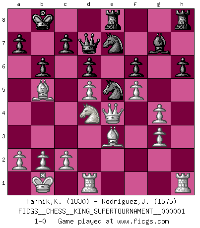 Last move : 1-0 2018 February 10 19:46:13 [Event "FICGS__CHESS__KING_SUPERTOURNAMENT__000001"] [Site "FICGS"] [Date "2018.01.18"] [Round "1"] [White "Farnik,Kym"] [Black "Rodriguez,Juan Antonio"] [Result "1-0"] [WhiteElo "1830"] [BlackElo "1575"] 1.e4 e5 2.f4 exf4 3.Nf3 g5 4.d4 Bg7 5.Nc3 d6 6.g3 g4 7.Nh4 f3 8.Be3 Nc6 9.Qd2 Nge7 10.O-O-O Bd7 11.h3 Ng6 12.Nf5 Bxf5 13.exf5 Nge7 14.hxg4 Qd7 15.Qf2 O-O-O 16.Qxf3 f6 17.Kb1 h6 18.d5 Ne5 19.Qe4 Kb8 20.Nb5 b6 21.Nd4 Rde8 22.Bb5 1-0 Kym Farnik Thanks for the game KGA : Rosentreter gambit Queenside Castling by player White (move 10) Queenside Castling by player Black (move 15) Player White won this chess game. Follow this game move after move (download)Excellence at Chess is one mark of a scheming mind. (Sir Arthur Conan Doyle) Ihnen, Herr Lasker, habe ich nur drei Worte zu sagen: Schach und matt. (Siegbert Tarrasch) Un mal día en el Ajedrez, es mejor que cualquier buen día en el trabajo. (Anonymous) L'attaque fait le spectacle, la défense gagne les matchs. (Dicton footballistique) The project of the man are lower than those of the sky. (Chinese proverb)