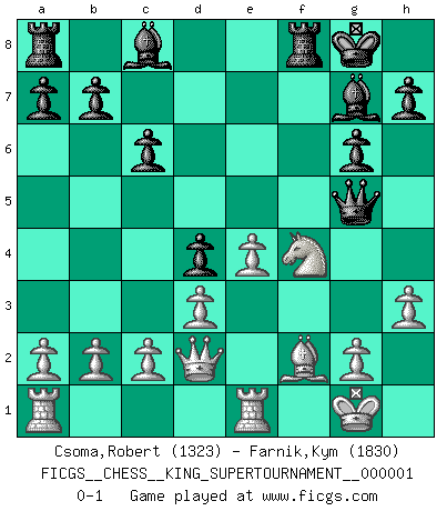 Last move : 0-1 2018 February 6 13:38:55 [Event "FICGS__CHESS__KING_SUPERTOURNAMENT__000001"] [Site "FICGS"] [Date "2018.01.18"] [Round "1"] [White "Csoma,Robert"] [Black "Farnik,Kym"] [Result "0-1"] [WhiteElo "1323"] [BlackElo "1830"] 1.e4 e5 2.f4 Nc6 3.Nf3 f5 4.d3 d6 5.Be2 Nf6 6.Nc3 g6 7.O-O Bg7 8.h3 O-O 9.Be3 Nh5 10.fxe5 Ng3 11.Re1 f4 12.Bf2 dxe5 13.Nd5 Nxe2+ 14.Qxe2 Nd4 15.Nxd4 exd4 16.Qd2 f3 17.Bg3 c6 18.Nf4 f2+ 19.Bxf2 Qg5 0-1 King's gambit Kingside Castling by player White (move 7) Kingside Castling by player Black (move 8) Player Black won this chess game. Follow this game move after move (download)The enormous mental resilience, without which no Chess player can exist, was so much taken up by Chess that he could never free his mind of this game. (Albert Einstein) Nie in meinem Leben habe ich die französische Verteidigung gespielt, welche die Stumpfsinnigste von allen ist. (Wilhelm Steinitz) El Ajedrez es un juego terrible. Si no dominas el centro, tu oponente tiene una posición mas libre. Si tu tienes el centro, entonces realmente tienes algo de que preocuparte. (Siegbert Tarrasch) Celui qui prend des risques peut perdre, celui qui n'en prend pas perd toujours. (Xavier Tartacover) A good aphorism is too hard for the tooth of time, and is not worn away with the centuries, although it serves as food for every speech. (Friedrich Nietzsche)