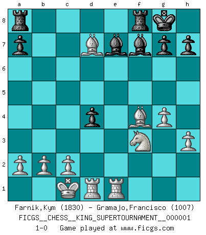 Last move : 1-0 2018 March 10 5:4:21 [Event "FICGS__CHESS__KING_SUPERTOURNAMENT__000001"] [Site "FICGS"] [Date "2018.01.18"] [Round "1"] [White "Farnik,Kym"] [Black "Gramajo,Francisco"] [Result "1-0"] [WhiteElo "1830"] [BlackElo "1007"] 1.e4 e5 2.f4 exf4 3.Nf3 d6 4.d4 Bg4 5.Bxf4 Nf6 6.h3 Bh5 7.Nc3 Nbd7 8.Qe2 c6 9.O-O-O b5 10.e5 dxe5 11.dxe5 Nd5 12.Nxd5 cxd5 13.g4 Bg6 14.e6 fxe6 15.Qxe6+ Be7 16.Bxb5 Bf7 17.Qf5 O-O 18.Qxd7 Qxd7 19.Bxd7 d4 20.Rhe1 1-0 This chess game has been lost on time (started : 2018.01.18 21:28:44) KGA : Fischer defense Queenside Castling by player White (move 9) Kingside Castling by player Black (move 17) Player White won this chess game. Follow this game move after move (download)Chess is a fighting game which is purely intellectual and includes chance. (Richard Reti) Ich spiele ehrlich und spiele, um zu gewinnen. Wenn ich verliere nehme ich meine Medizin. (Robert James Fischer) No existe un remordimiento como el remordimiento del Ajedrez. (H. G. Wells) La solitude du joueur d'Echecs à l'approche du mat est semblable à celle du condamné. (Francis Szpiner) When you've done things right people won't know you've done anything at all. (Futurama)