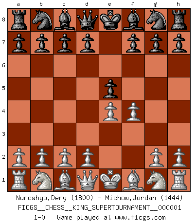 Last move : 1-0 2018 February 18 2:26:15 [Event "FICGS__CHESS__KING_SUPERTOURNAMENT__000001"] [Site "FICGS"] [Date "2018.01.18"] [Round "1"] [White "Nurcahyo,Dery"] [Black "Michow,Jordan"] [Result "1-0"] [WhiteElo "1800"] [BlackElo "1444"] 1.e4 e5 2.f4 1-0 This chess game has been lost on time (started : 2018.01.18 21:28:44) King's gambit Player White won this chess game. Follow this game move after move (download)You sit at the board and suddenly your heart leaps. Your hand trembles to pick up the piece and move it. But what Chess teaches you is that you must sit there calmly and think about whether it's really a good idea and whether there are other better ideas. (Stanley Kubrick) Moralische Siege zählen nicht. (Savielly Grigorievitsch Tartakower) El ganador de una partida es aquel jugador que hace el penúltimo error. (Savielly Tartakover) Les Echecs, c'est l'art de la guerre sans les charniers, c'est la résurrection des morts tombés au champ d'honneur, l'espoir perpétuel, la suprématie de l'intelligence sur la force, la culture de l'esprit. (F. Szpiner) You can't play chess if you're groggy from pills. (Anatoly Karpov)
