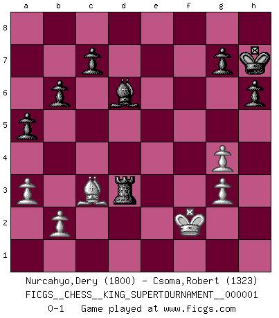 Last move : 0-1 2018 March 31 11:4:29 [Event "FICGS__CHESS__KING_SUPERTOURNAMENT__000001"] [Site "FICGS"] [Date "2018.01.18"] [Round "1"] [White "Nurcahyo,Dery"] [Black "Csoma,Robert"] [Result "0-1"] [WhiteElo "1800"] [BlackElo "1323"] 1.e4 e5 2.f4 exf4 3.Qg4 d5 4.Qxf4 Bd6 5.Qe3 Qh4+ 6.g3 Qxe4 7.Qxe4+ dxe4 8.Nc3 Nf6 9.Bc4 O-O 10.Nge2 Nc6 11.d4 Bg4 12.Be3 Nb4 13.Rc1 Bf3 14.O-O a6 15.Bb3 Ng4 16.Bf2 e3 17.Be1 Bxe2 18.Nxe2 a5 19.a3 Nc6 20.Kg2 Kh8 21.Bxf7 Nd8 22.h3 Rxf7 23.hxg4 Rxf1 24.Kxf1 Nc6 25.c4 Rf8+ 26.Kg2 b6 27.Bc3 Rf2+ 28.Kh3 Rxe2 29.Rf1 h6 30.Rf5 Ne7 31.Rf3 Kh7 32.d5 Ng6 33.Rf7 Ne5 34.Rf1 Rf2 35.Re1 e2 36.Bd4 Rf1 37.Rxe2 Nxc4 38.Kg2 Rd1 39.Bc3 Rxd5 40.Rf2 Ne3+ 41.Kf3 Nd1 42.Kg2 Nxf2 43.Kxf2 Rd3 0-1 King's gambit accepted Kingside Castling by player Black (move 9) Kingside Castling by player White (move 14) Player Black won this chess game. Follow this game move after move (download)Without error there can be no brilliancy. (Emanuel Lasker) Zeige mir drei Eröffnungsvarianten und ich beweise dir, dass zwei davon inkorrekt sind. (Emanuel Lasker) Bobby es el jugador de Ajedrez mas fino que este país jamás haya producido. Su memoria para las movidas, su brillantez en soñar combinaciones y su feróz determinación por la victoria son algo extraño. (John Collins) Si le désir cupide (et stupide) de gagner est une inépuisable source de souffrance, une combinaison brillante sur l'échiquier est une découverte : le coquelicot qui s'épanouit lorsque apparaît la Voie Lactée. (Arrabal) There are more things in heaven and earth than practically anywhere else. (Unknown)