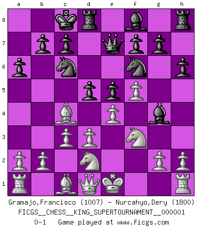 Last move : 0-1 2018 March 1 3:45:12 [Event "FICGS__CHESS__KING_SUPERTOURNAMENT__000001"] [Site "FICGS"] [Date "2018.01.18"] [Round "1"] [White "Gramajo,Francisco"] [Black "Nurcahyo,Dery"] [Result "0-1"] [WhiteElo "1007"] [BlackElo "1800"] 1.e4 e5 2.f4 Nc6 3.Nf3 d6 4.Bc4 h6 5.c3 Nf6 6.d3 a6 7.Qb3 Qe7 8.Qd1 Bg4 9.Nbd2 O-O-O 10.f5 d5 0-1 This chess game has been lost on time (started : 2018.01.18 21:28:44) King's gambit Queenside Castling by player Black (move 9) Player Black won this chess game. Follow this game move after move (download)Chess makes man wiser and clear-sighted. (Vladimir Putin) Es ist peinlich, dass ich nie Weltmeister wurde. Es wäre leicht, Leonid Breschnjew als Ursache vorzuschieben, dessen Apparat den Vorzeigekommunisten Anatoli Karpow in allem unterstützte. Aber Garri Kasparow zum Beispiel, der ebenfalls von den Sowjets unerwünscht war, hat trotz der Widerstände den WM-Titel erobert. (Viktor Kortschnoi) Yo no le temo a Spassky. Todos saben que yo soy el mejor. Uno no necesita un torneo para probarlo. (Bobby Fischer) Si rien de grave n'est détecté lors de l'analyse d'une position, on joue alors le coup. Seconde règle de Blumenfeld. Remember : Your focus determines your reality. (Qui-Gon Jinn in Star Wars ep.1)