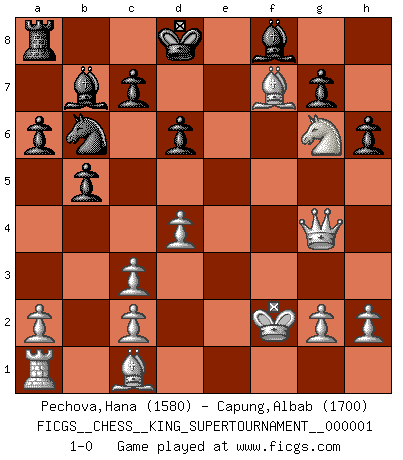 Last move : 1-0 2018 May 19 23:36:18 [Event "FICGS__CHESS__KING_SUPERTOURNAMENT__000001"] [Site "FICGS"] [Date "2018.01.18"] [Round "1"] [White "Pechova,Hana"] [Black "Capung,Albab"] [Result "1-0"] [WhiteElo "1580"] [BlackElo "1700"] 1.e4 e5 2.f4 exf4 3.Nf3 d6 4.Bc4 Nf6 5.Nc3 a6 6.d4 b5 7.Bb3 Bb7 8.Ng5 h6 9.Nxf7 Qe7 10.Nxh8 Nxe4 11.O-O Nxc3 12.bxc3 Qg5 13.Rf2 Nd7 14.Bxf4 Qh4 15.Bf7+ Kd8 16.Ng6 Qf6 17.Bc1 Qxf2+ 18.Kxf2 Nb6 19.Qg4 1-0 This chess game has been lost on time (started : 2018.01.18 21:28:44) KGA : Fischer defense Kingside Castling by player White (move 11) Player White won this chess game. Follow this game move after move (download)Pawns are born free, yet they are everywhere in chains. (Rick Kennedy) Jeder Schachmeister war einmal ein Anfänger. (Irving Chernev) La señal de un Gran Maestro es su habilidad de ganar una partida rápidamente y sin dolor. (Irving Chernev) J'ai vu le vaincu d'Echecs jouer des années durant dans l'espoir de la fête de la victoire. Car tu es plus riche de ce qu'elle existe si même elle n'est point pour toi. Ainsi de la perle du fond des mers. (Antoine de Saint-Exupéry) Mac users swear by their computers. PC users swear at their computers. (Author unknown)