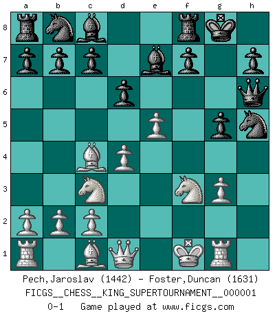 Last move : 0-1 2018 April 5 12:19:43 [Event "FICGS__CHESS__KING_SUPERTOURNAMENT__000001"] [Site "FICGS"] [Date "2018.01.18"] [Round "1"] [White "Pech,Jaroslav"] [Black "Foster,Duncan"] [Result "0-1"] [WhiteElo "1442"] [BlackElo "1631"] 1.e4 e5 2.f4 exf4 3.Bc4 Qh4+ 4.Kf1 Nf6 5.Nf3 Qh6 6.Nc3 Be7 7.e5 Nh5 8.Rg1 O-O 9.d4 g5 10.g4 fxg3 11.hxg3 d6 0-1 KGA : Bishop's gambit Kingside Castling by player Black (move 8) Player Black won this chess game. Follow this game move after move (download)Chess problems demand from the composer the same virtues that characterize all worthwhile art: originality, invention, conciseness, harmony, complexity, and splendid insincerity. (Vladimir Nabokov) Der Partner hat auch seine Existenzberechtigung. (Savielly Grigorievitsch Tartakower) Los finales de Peón son del Ajedrez lo que el cesped es del Golf. (Cecil Purdy) Celui qui prend des risques peut perdre, celui qui n'en prend pas perd toujours. (Xavier Tartacover) Beta. Software undergoes beta testing shortly before it's released. Beta is latin for still doesn't work. (Anonymous)