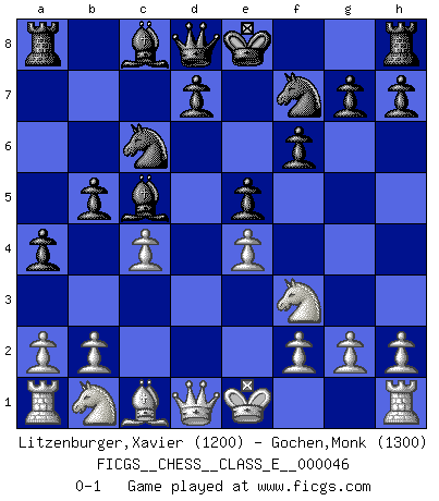 Last move : 0-1 2007 August 2 7:50:11 [Event "FICGS__CHESS__CLASS_E__000046"] [Site "FICGS"] [Date "2007.04.22"] [Round "1"] [White "Litzenburger,Xavier"] [Black "Gochen,Monk"] [Result "0-1"] [WhiteElo "1200"] [BlackElo "1300"] 1.e4 e5 2.Nf3 f6 3.Bc4 Nh6 4.c3 c6 5.d4 b5 6.Bb3 a5 7.d5 a4 8.dxc6 Nxc6 9.Bf7+ Nxf7 10.c4 Bc5 0-1 Damiano's defense Player Black won this chess game. Follow this game move after move (download)Before the endgame, the Gods have placed the middle game. (Siegbert Tarrasch) Die Jungen erwarten, dass Opa einfach umfällt. Dann aber kann Opa fünf Stunden lang Schach spielen und die jungen Gegner an die Wand drücken. (Viktor Kortschnoi) Morphy probablemente fue el genio más grande de todos. (Bobby Fischer) Le joueur d'Echecs qui veut atteindre le top est obligé de développer son propre credo créatif. Alexeï Stepanovicth Souétine. Il est facile d'écrire des livres ! Ce qui est difficile, c'est de jouer ! (Alexeï Stepanovicth Souétine) Whoever said the pen is mightier than the sword obviously never encountered automatic weapons. (US General Douglas MacArthur)