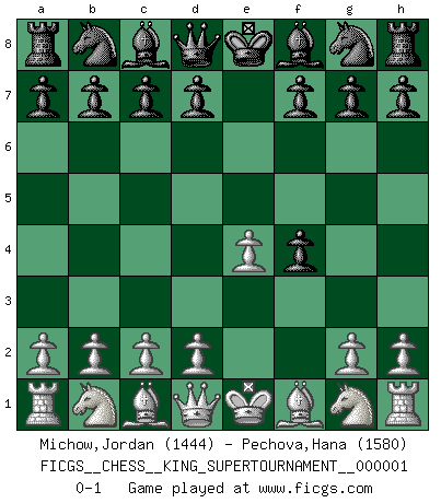 Last move : 0-1 2018 February 18 2:26:15 [Event "FICGS__CHESS__KING_SUPERTOURNAMENT__000001"] [Site "FICGS"] [Date "2018.01.18"] [Round "1"] [White "Michow,Jordan"] [Black "Pechova,Hana"] [Result "0-1"] [WhiteElo "1444"] [BlackElo "1580"] 1.e4 e5 2.f4 exf4 0-1 This chess game has been lost on time (started : 2018.01.18 21:28:44) King's gambit accepted Player Black won this chess game. Follow this game move after move (download)All my games are real. (Bobby Fischer) Die Leute spielen gegen mich seit 15 Jahren unter Ihren Möglichkeiten. (Robert James Fischer) Yo no le temo a Spassky. Todos saben que yo soy el mejor. Uno no necesita un torneo para probarlo. (Bobby Fischer) J'ai toujours senti une vague pitié pour l'homme qui ne connaît rien aux échecs, tout comme j'en aurais pour un homme ignorant de l'amour. Les Echecs, comme la musique ou comme l'amour, ont le pouvoir de rendre heureux. (Siegbert Tarrasch) Work expands to fill the time available. (C. Northcote Parkinson, in Parkinson's Laws)