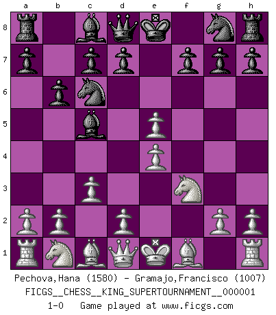 Last move : 1-0 2018 March 7 4:40:17 [Event "FICGS__CHESS__KING_SUPERTOURNAMENT__000001"] [Site "FICGS"] [Date "2018.01.18"] [Round "1"] [White "Pechova,Hana"] [Black "Gramajo,Francisco"] [Result "1-0"] [WhiteElo "1580"] [BlackElo "1007"] 1.e4 e5 2.f4 Nc6 3.Nf3 Bc5 4.fxe5 b6 5.c3 1-0 This chess game has been lost on time (started : 2018.01.18 21:28:44) King's gambit Player White won this chess game. Follow this game move after move (download)Up to this point White has been following well-known analysis. But now he makes a fatal error: he begins to use his own head. (Siegbert Tarrasch) Jeder Fehler erscheint unglaublich dumm, wenn andre ihn begehen. (Georg Christoph Lichtenberg) Los errores estan ahí, esperando a que se cometan. (Savielly Tartakower) Votre prénom est 'Tactique', votre deuxième prénom est 'Tactique' et votre nom est 'Tactique'. (Ken Smith) God, you are such an idiot. - Actually, I thought I was more of a jerk. (Gregory House to Stacy Warner, House M.D.)