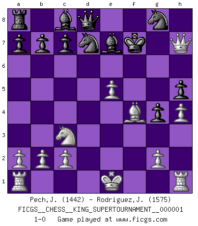 Last move : 1-0 2018 April 10 0:41:54 [Event "FICGS__CHESS__KING_SUPERTOURNAMENT__000001"] [Site "FICGS"] [Date "2018.01.18"] [Round "1"] [White "Pech,Jaroslav"] [Black "Rodriguez,Juan Antonio"] [Result "1-0"] [WhiteElo "1442"] [BlackElo "1575"] 1.e4 e5 2.f4 exf4 3.Nf3 g5 4.h4 g4 5.Ne5 h5 6.Bc4 Rh7 7.d4 d6 8.Nxf7 Rxf7 9.Bxf7+ Kxf7 10.Bxf4 Be7 11.Nc3 Nd7 12.Qd3 Ngf6 13.e5 dxe5 14.dxe5 Ng8 15.Qh7+ 1-0 KGA : Kieseritsky, long whip (Stockwhip, Classical) defense Player White won this chess game. Follow this game move after move (download)Could we look into the head of a Chess player, we should see there a whole world of feelings, images, ideas, emotion and passion. (Alfred Binet) Kombinieren und Schwarzhandel gehören verboten. (Savielly Grigorievitsch Tartakower) Yo no creo en la psicología. Yo creo en las buenas movidas. (Bobby Fischer) Karpov est une pièce de musée. (Garry Kasparov) Luck has a peculiar habit of favoring those who don't depend on it. (Author unknown)