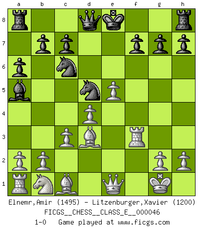 Last move : 1-0 2007 July 29 7:17:55 [Event "FICGS__CHESS__CLASS_E__000046"] [Site "FICGS"] [Date "2007.04.22"] [Round "1"] [White "Elnemr,Amir"] [Black "Litzenburger,Xavier"] [Result "1-0"] [WhiteElo "1495"] [BlackElo "1200"] 1.e4 e5 2.f4 d5 3.exd5 Nf6 4.fxe5 Nxd5 5.Nf3 Nc6 6.Bb5 Bc5 7.d4 Bb4+ 8.c3 Ba5 9.O-O a6 10.Bd3 Bg4 11.Qe1 Bxf3 12.Rxf3 1-0 KGD : Falkbeer counter-gambit Kingside Castling by player White (move 9) Player White won this chess game. Follow this game move after move (download)When you are lonely, when you feel yourself an alien in the world, play Chess. This will raise your spirits and be your counselor in war. (Aristotle) Dein Körper muss in Topform sein. Dein Schach verfällt, wenn dein Körper verfällt. Der Körper kann nicht vom Geist getrennt werden. (Robert James Fischer) Es muy difícil jugar en contra de la teoría de Einstein. - en su primera derrota en contra de Fischer (Mikhail Tal) Mais n'est-ce pas déjà le limiter injurieusement que d'appeler les échecs un jeu? N'est-ce pas aussi une science, un art, ou quelque chose qui, comme le cercueil de Mahomet entre ciel et terre, est suspendu entre l'un et l'autre, et qui réunit un nombre incroyable de contraires ? (Stefan Zweig) To err is human, to shift the blame on someone else is tactical. (Mladen Jankovic)