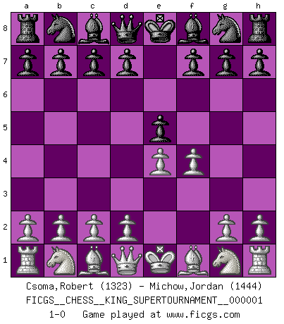 Last move : 1-0 2018 February 18 2:26:15 [Event "FICGS__CHESS__KING_SUPERTOURNAMENT__000001"] [Site "FICGS"] [Date "2018.01.18"] [Round "1"] [White "Csoma,Robert"] [Black "Michow,Jordan"] [Result "1-0"] [WhiteElo "1323"] [BlackElo "1444"] 1.e4 e5 2.f4 1-0 This chess game has been lost on time (started : 2018.01.18 21:28:44) King's gambit Player White won this chess game. Follow this game move after move (download)The tactician must know what to do whenever something needs doing; the strategist must know what to do when nothing needs doing. (Savielly Tartakover) Alles was am Schachbrett zählt sind gute Züge. (Robert James Fischer) La única cosa que los jugadores de Ajedrez tienen en común, es el Ajedrez. (Lodewijk Prins) Plusieurs personnes se sont demandées comment Tal faisait pour gagner... En fait, c'est très simple ! Il met ses pièces au centre de l'échiquier et les sacrifie quelque part ! (David Bronstein) After growing wildly for years, the field of computing appears to be reaching its infancy. (John Pierce)