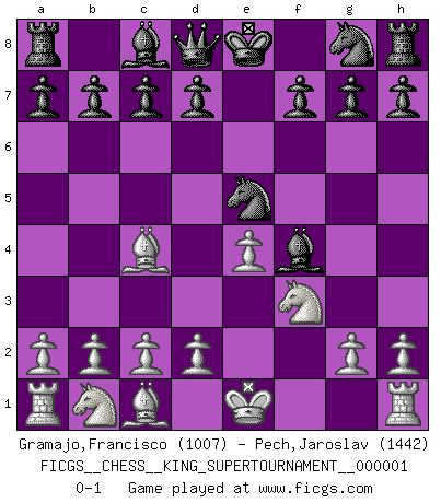 Last move : 0-1 2018 April 12 8:53:32 [Event "FICGS__CHESS__KING_SUPERTOURNAMENT__000001"] [Site "FICGS"] [Date "2018.01.18"] [Round "1"] [White "Gramajo,Francisco"] [Black "Pech,Jaroslav"] [Result "0-1"] [WhiteElo "1007"] [BlackElo "1442"] 1.e4 e5 2.f4 exf4 3.Qf3 Nc6 4.Qxf4 Bd6 5.Bc4 Bxf4 6.Nf3 Ne5 0-1 This chess game has been lost on time (started : 2018.01.18 21:28:44) KGA : Breyer gambit Player Black won this chess game. Follow this game move after move (download)By playing at Chess then, we may learn: First: Foresight... Second: Circumspection... Third: Caution... And lastly, we learn by Chess the habit of not being discouraged by present bad appearances in the state of our affairs, the habit of hoping for a favorable chance, and that of persevering in the secrets of resources. (Benjamin Franklin) Taktik ist was man tun muß, wenn etwas zu tun ist. Strategie ist was man tun muß, wenn nichts zu tun ist. (Savielly Grigorievitsch Tartakower) Peones: ellos son el alma de esta partida, solos forman el ataque y la defensa. (Philidor) Il a essayé de se convaincre qu'il pourrait empêcher toutes les erreurs et ne jamais perdre. L'horreur ! Gary Kasparov au sujet de Robert Fischer. The problem with manipulation is that people can turn on you. (Horatio Caine, C.S.I. Miami)