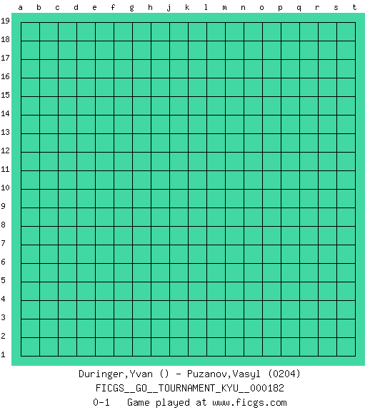 Last move : 0-1 2018 February 19 2:29:23 [Event "FICGS__GO__TOURNAMENT_KYU__000182"] [Site "FICGS"] [Date "2018.01.19"] [Round "1"] [Black "Duringer,Yvan"] [White "Puzanov,Vasyl"] [Result "0-1"] [Rating 2 "0204"] 0-1 This go game has been lost on time (started : 2018.01.19 22:10:34) Here are the names of the openings (joseki) played in the four corners : Player White won this Go (weiqi, baduk) game. Follow this game move after move (download)Conservative and slow will win. Believe it ! (Anonymous) Better than a thousand days of diligent study is one day with a great teacher. (Japanese proverb)
