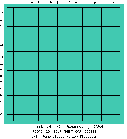 Last move : 0-1 2018 February 19 2:29:23 [Event "FICGS__GO__TOURNAMENT_KYU__000182"] [Site "FICGS"] [Date "2018.01.19"] [Round "1"] [Black "Moshchenskii,Max"] [White "Puzanov,Vasyl"] [Result "0-1"] [Rating 2 "0204"] 0-1 This go game has been lost on time (started : 2018.01.19 22:10:34) Here are the names of the openings (joseki) played in the four corners : Player White won this Go (weiqi, baduk) game. Follow this game move after move (download)When your opponent has two weak groups, attack them both at once. (Anonymous) It's not the size of the dog in the fight, it's the size of the fight in the dog. (Mark Twain)