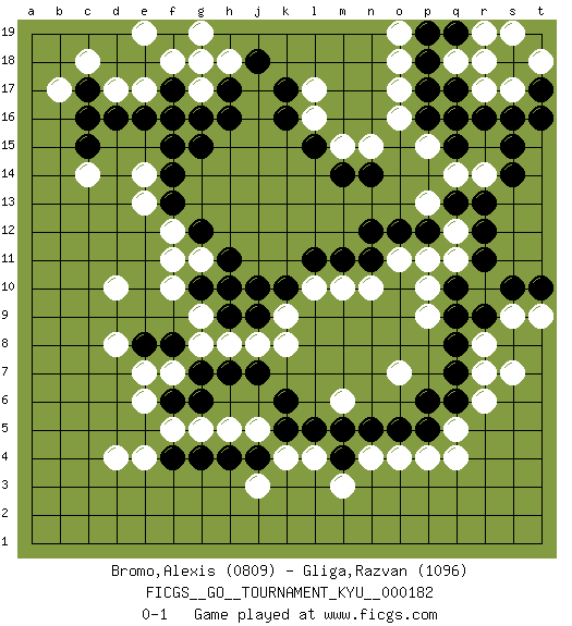 Last move : 0-1 2018 February 13 16:3:29 [Event "FICGS__GO__TOURNAMENT_KYU__000182"] [Site "FICGS"] [Date "2018.01.19"] [Round "1"] [Black "Bromo,Alexis"] [White "Gliga,Razvan"] [Result "0-1"] [Rating 1 "0809"] [Rating 2 "1096"] 1.q16 d4 2.d16 q4 3.q10 d10 4.k16 k4 5.k10 c14 6.c15 g16 7.h17 e17 8.e16 g17 9.h16 o17 10.p17 o16 11.p16 l17 12.k17 l16 13.g15 d17 14.c17 c18 15.f15 h18 16.j18 g19 17.f17 f18 18.f16 b17 19.c16 e19 20.g18 g17 21.g16 g18 22.l15 m15 23.m14 n15 24.n14 p15 25.q15 p13 26.q13 r8 27.r9 r17 28.r16 q18 29.p18 s17 30.s16 s19 31.t17 t18 32.t16 o11 33.n12 q11 34.r11 q12 35.r12 p10 36.q9 p9 37.q8 r7 38.q7 r6 39.q6 q5 40.p5 p4 41.p12 p11 42.o12 m10 43.n11 n10 44.m11 l10 45.l11 m6 46.o5 o4 47.n5 n4 48.m5 e14 49.f14 e13 50.f13 f11 51.g12 g11 52.h11 o18 53.q17 r18 54.q19 q14 55.r13 r14 56.p19 r19 57.s14 o19 58.s15 s9 59.s10 t9 60.t10 s7 61.p6 o7 62.m4 m3 63.l5 l4 64.k5 j5 65.k6 k9 66.j9 k8 67.j7 j8 68.j10 h8 69.h7 f7 70.g6 g5 71.j4 j3 72.h4 h5 73.g4 f5 74.f4 e4 75.f6 e6 76.g7 g8 77.h9 g9 78.g10 f10 79.h10 f12 80.f8 e7 81.e8 d8 0-1 Here are the names of the openings (joseki) played in the four corners : Corner d16 : d16 c14 Hoshi (Hwajeom, Seongjeom, Xingwei`) 4-4 Point. The star or hoshi (4-4) point, emphasizing influence at the potential expense of territory. Ikken Kakari (Hankan Keolch'im, Yi Gua`jiao~, 1-Space Low Approach). White 2 is the standard approach move to the 4-4. Corner q16 : q16 o17 Hoshi (Hwajeom, Seongjeom, Xingwei`) 4-4 Point. The star or hoshi (4-4) point, emphasizing influence at the potential expense of territory. Ikken Kakari (Hankan Keolch'im, Yi Gua`jiao~, 1-Space Low Approach). White 2 is the standard approach move to the 4-4. Player White won this Go (weiqi, baduk) game. Follow this game move after move (download)Go uses the most elemental materials and concepts - line and circle, wood and stone, black and white - combining them with simple rules to generate subtle strategies and complex tactics that stagger the imagination. (Iwamoto Kaoru, 9 dan professional Go player and former Honinbo title holder) All politicians must be presumed guilty until they are proven innocent. (Dinesh De Silva)