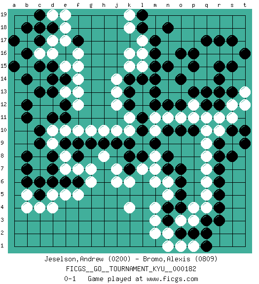 Last move : 0-1 2018 June 30 17:5:29 [Event "FICGS__GO__TOURNAMENT_KYU__000182"] [Site "FICGS"] [Date "2018.01.19"] [Round "1"] [Black "Jeselson,Andrew"] [White "Bromo,Alexis"] [Result "0-1"] [Rating 1 "0200"] [Rating 2 "0809"] 1.q17 d4 2.q3 d16 3.r15 k16 4.r5 k4 5.d13 c12 6.e11 d10 7.e9 d9 8.d7 c6 9.c9 c11 10.c10 e10 11.d11 e8 12.f9 f10 13.f8 e7 14.d6 d5 15.c5 c8 16.b8 c7 17.e6 f7 18.f6 g7 19.g9 g10 20.h9 h10 21.j9 j10 22.k9 k10 23.d8 g6 24.b6 f5 25.b7 c4 26.c13 d12 27.e12 e13 28.b12 f12 29.b11 d14 30.e14 f13 31.d15 c14 32.c15 e15 33.b14 f14 34.d14 c16 35.o7 m6 36.o12 b5 37.c6 b4 38.m17 l17 39.m16 l16 40.k13 j13 41.k7 j6 42.n4 m3 43.k14 j14 44.k12 j12 45.l10 k11 46.l11 k15 47.m15 l15 48.l14 l7 49.l8 m8 50.m9 j7 51.k8 k6 52.n8 m7 53.n7 n6 54.o6 n5 55.o5 m4 56.n3 n2 57.o2 m2 58.l18 k18 59.l19 k19 60.n18 r10 61.r9 r11 62.r12 q9 63.r8 q8 64.r7 q7 65.r6 q6 66.p10 q10 67.q12 s12 68.s13 p11 69.o10 o11 70.n12 p12 71.p13 n11 72.m12 m11 73.n10 q11 74.r13 s9 75.s8 o13 76.o14 n13 77.m13 n14 78.n15 p14 79.m14 q5 80.r4 q4 81.r3 o15 82.p15 q14 83.r14 q15 84.o16 q16 85.p16 r16 86.r17 s16 87.s17 t13 88.s15 t12 89.s10 s11 90.t9 p3 91.p2 o3 92.o4 p4 93.t16 b15 94.b16 b17 95.a15 e5 96.q13 o1 97.q1 n1 98.q2 p1 99.e16 f15 100.c17 d17 101.c18 e17 102.d18 e18 103.b18 d19 104.c19 e19 105.a17 m10 106.t10 h8 107.f17 f16 0-1 Here are the names of the openings (joseki) played in the four corners : Corner d16 : d16 d13 Hoshi (Hwajeom, Seongjeom, Xingwei`) 4-4 Point. The star or hoshi (4-4) point, emphasizing influence at the potential expense of territory. Niken Takagakari (Dukan Nop'dakeolch'im, E`r Gaojia, 2-Space High Approach). Black 2 is a light approach move. Rarely played in even games, Black 2 is typically employed in handicap games. White continues with 6-4 or 3-10. In Korean Sunjang Baduk White has a stone on 8-4. Corner d4 : d4 e9 Hoshi (Hwajeom, Seongjeom, Xingwei`) 4-4 Point. The star or hoshi (4-4) point, emphasizing influence at the potential expense of territory. Player White won this Go (weiqi, baduk) game. Follow this game move after move (download)Keshi is worth as much as an invasion ! (Anonymous) The modern world has divided itself into Conservatives and Progressives. The business of Progressives is to go on making mistakes. The business of the Conservatives is to prevent the mistakes from being corrected. (G.K. Chesterton)