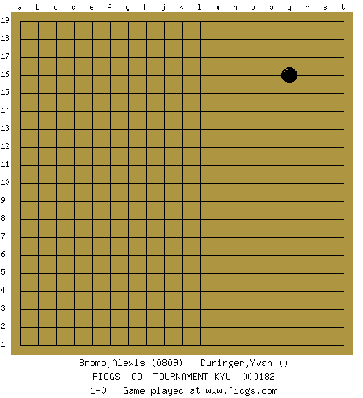 Last move : 1-0 2018 February 19 14:31:43 [Event "FICGS__GO__TOURNAMENT_KYU__000182"] [Site "FICGS"] [Date "2018.01.19"] [Round "1"] [Black "Bromo,Alexis"] [White "Duringer,Yvan"] [Result "1-0"] [Rating 1 "0809"] 1.q16 1-0 This go game has been lost on time (started : 2018.01.19 22:10:34) Here are the names of the openings (joseki) played in the four corners : Player Black won this Go (weiqi, baduk) game. Follow this game move after move (download)Nothing requires doing this or that, but necessity exists. (Pierre Audouard) At work, the authority of a person is inversely proportional to the number of pens that person is carrying. (Dan Rotaru)