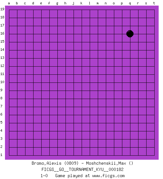 Last move : 1-0 2018 February 19 14:31:43 [Event "FICGS__GO__TOURNAMENT_KYU__000182"] [Site "FICGS"] [Date "2018.01.19"] [Round "1"] [Black "Bromo,Alexis"] [White "Moshchenskii,Max"] [Result "1-0"] [Rating 1 "0809"] 1.q16 1-0 This go game has been lost on time (started : 2018.01.19 22:10:34) Here are the names of the openings (joseki) played in the four corners : Player Black won this Go (weiqi, baduk) game. Follow this game move after move (download)Do not fear furikawari. (Anonymous) Gambling is the son of avarice and the father of despair. (French proverb)