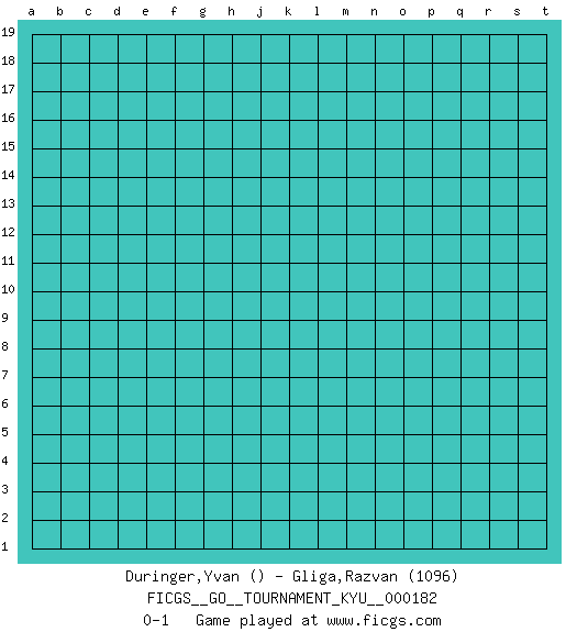 Last move : 0-1 2018 February 19 2:29:23 [Event "FICGS__GO__TOURNAMENT_KYU__000182"] [Site "FICGS"] [Date "2018.01.19"] [Round "1"] [Black "Duringer,Yvan"] [White "Gliga,Razvan"] [Result "0-1"] [Rating 2 "1096"] 0-1 This go game has been lost on time (started : 2018.01.19 22:10:34) Here are the names of the openings (joseki) played in the four corners : Player White won this Go (weiqi, baduk) game. Follow this game move after move (download)The enemy's vital point is your own. (Anonymous) Life doesn't imitate art, it imitates bad television. (Woody Allen)