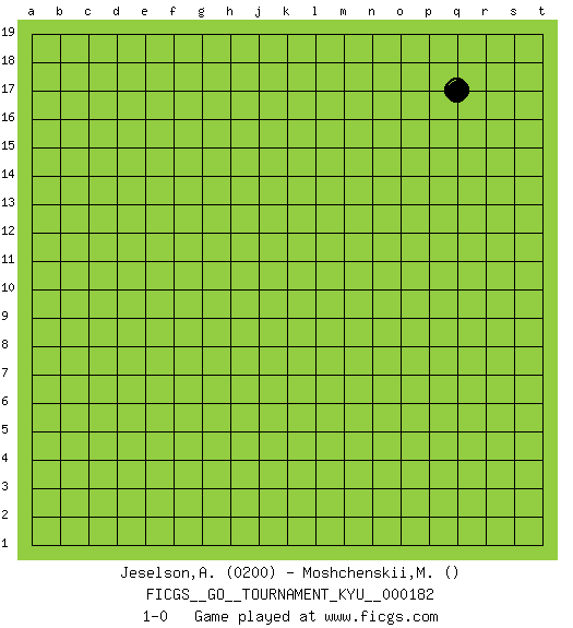 Last move : 1-0 2018 February 19 2:29:23 [Event "FICGS__GO__TOURNAMENT_KYU__000182"] [Site "FICGS"] [Date "2018.01.19"] [Round "1"] [Black "Jeselson,Andrew"] [White "Moshchenskii,Max"] [Result "1-0"] [Rating 1 "0200"] 1.q17 1-0 This go game has been lost on time (started : 2018.01.19 22:10:34) Here are the names of the openings (joseki) played in the four corners : Player Black won this Go (weiqi, baduk) game. Follow this game move after move (download)One big eye kills one small eye. (Anonymous) Chess, like love, like music, has the power to make people happy. (Siegbert Tarrasch)