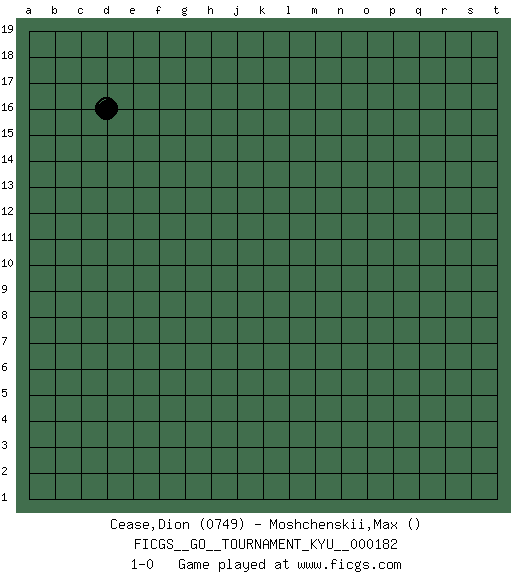 Last move : 1-0 2018 March 9 17:4:25 [Event "FICGS__GO__TOURNAMENT_KYU__000182"] [Site "FICGS"] [Date "2018.01.19"] [Round "1"] [Black "Cease,Dion"] [White "Moshchenskii,Max"] [Result "1-0"] [Rating 1 "0749"] 1.d16 1-0 This go game has been lost on time (started : 2018.01.19 22:10:34) Here are the names of the openings (joseki) played in the four corners : Player Black won this Go (weiqi, baduk) game. Follow this game move after move (download)Against three in a row, play right in the center. (Anonymous) Internet: Absolute communication, absolute isolation. (Paul Carvel)