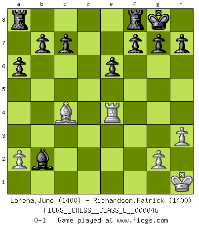 Last move : 0-1 2007 August 24 23:28:12 [Event "FICGS__CHESS__CLASS_E__000046"] [Site "FICGS"] [Date "2007.04.22"] [Round "1"] [White "Lorena,June"] [Black "Richardson,Patrick"] [Result "0-1"] [WhiteElo "1400"] [BlackElo "1400"] 1.d4 Nf6 2.Nc3 d5 3.e4 dxe4 4.f3 Nc6 5.Be3 Bf5 6.fxe4 Nxe4 7.Nf3 e6 8.Nxe4 Bxe4 9.Bc4 Be7 10.O-O O-O 11.Ne5 Nxe5 12.dxe5 Bg5 13.Qg4 Bxe3+ 14.Kh1 Bxc2 15.Rae1 Qd4 16.Qxd4 Bxd4 17.h3 a6 18.Re4 Bxe4 19.Rf4 Bxe5 20.Rxe4 Bxb2 0-1 This chess game has been lost on time (started : 2007.04.22 6:24:37) Queen's pawn game Kingside Castling by player White (move 10) Kingside Castling by player Black (move 10) Player Black won this chess game. Follow this game move after move (download)Some part of a mistake is always correct. (Savielly Tartakover) Schach ist ein schwarz-weisser Dschungel. (Garry Kasparov) Desconfianza es la característica mas necesaria de un jugador de Ajedrez. (Siegbert Tarrasch) Nous vivons dans un monde échiquéen : chaque jour qui passe est un défi à relever. (Philosophe Sasha) You know what they say : You lie down with the Devil, you wake up in Hell. (Horatio Caine, C.S.I. Miami)