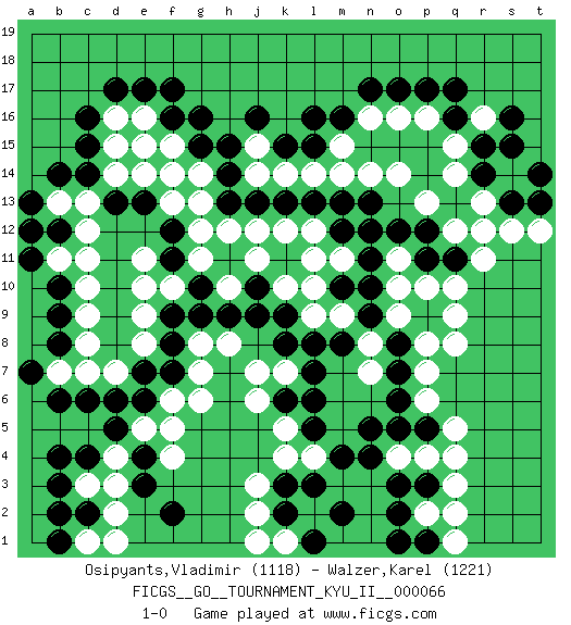 Last move : 1-0 2018 February 21 20:57:46 [Event "FICGS__GO__TOURNAMENT_KYU_II__000066"] [Site "FICGS"] [Date "2018.01.20"] [Round "1"] [Black "Osipyants,Vladimir"] [White "Walzer,Karel"] [Result "1-0"] [Rating 1 "1118"] [Rating 2 "1221"] 1.q16 d4 2.d17 q4 3.c15 d16 4.c16 d15 5.c14 d14 6.e17 e16 7.f17 c13 8.c6 c8 9.e6 f4 10.b4 c3 11.b3 e8 12.c2 d2 13.c4 d3 14.b2 g6 15.l3 j3 16.o3 o4 17.p3 p4 18.n4 q3 19.n5 q8 20.r14 r12 21.n17 p16 22.p17 o16 23.o17 n16 24.m16 n14 25.j16 m15 26.l16 q15 27.r15 r16 28.q17 q14 29.s16 k10 30.l7 k7 31.l6 m9 32.o8 o9 33.p9 q9 34.n9 o10 35.n10 p10 36.n11 n8 37.m8 n7 38.o7 p7 39.o6 p6 40.o5 j14 41.g15 g14 42.f14 f13 43.h14 g13 44.h13 h12 45.j13 k14 46.k13 l14 47.k8 l9 48.l8 j7 49.j9 j11 50.g9 f10 51.f9 e9 52.g10 g11 53.o12 p13 54.p11 q10 55.p12 r13 56.s13 s14 57.s15 s12 58.t14 f15 59.g16 k5 60.l5 k4 61.k3 l4 62.m4 j2 63.k2 p2 64.o2 q1 65.o1 k1 66.m2 b13 67.b14 l12 68.l13 k12 69.m13 b7 70.b6 e5 71.d5 f6 72.k6 j6 73.e7 h8 74.h9 g8 75.k9 l10 76.m12 j15 77.h15 p8 78.l15 m14 79.n13 o14 80.j10 j12 81.q11 r11 82.f16 e15 83.a13 a12 84.d13 e14 85.b12 c12 86.a11 c11 87.b10 c10 88.b9 c9 89.b8 c7 90.a7 d7 91.d6 c1 92.b1 d1 93.l1 j1 94.p1 q2 95.p5 q5 96.f7 g7 97.k15 t12 98.t13 b11 99.a12 m11 100.m10 l11 101.f8 o11 102.n12 q12 103.e13 f14 104.f11 e10 105.f12 g12 106.h11 h10 107.e3 e11 108.e4 f5 109.f2 1-0 Here are the names of the openings (joseki) played in the four corners : Corner d4 : d4 c6 Hoshi (Hwajeom, Seongjeom, Xingwei`) 4-4 Point. The star or hoshi (4-4) point, emphasizing influence at the potential expense of territory. Ikken Kakari (Hankan Keolch'im, Yi Gua`jiao~, 1-Space Low Approach). Black 2 is the standard approach move to the 4-4. Corner q4 : q4 l3 Hoshi (Hwajeom, Seongjeom, Xingwei`) 4-4 Point. The star or hoshi (4-4) point, emphasizing influence at the potential expense of territory. Player Black won this Go (weiqi, baduk) game. Follow this game move after move (download)White is always trying to kill a bigger group than black is trying to save. (Anonymous) Go and wake up your luck. (Persian saying)