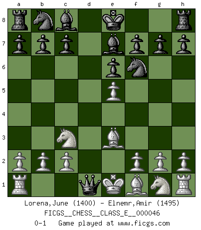 Last move : 0-1 2007 June 17 13:59:59 [Event "FICGS__CHESS__CLASS_E__000046"] [Site "FICGS"] [Date "2007.04.22"] [Round "1"] [White "Lorena,June"] [Black "Elnemr,Amir"] [Result "0-1"] [WhiteElo "1400"] [BlackElo "1495"] 1.d4 e6 2.Nc3 Nf6 3.e4 d6 4.Be3 Be7 5.e5 dxe5 6.dxe5 Qxd1+ 0-1 This chess game has been lost on time (started : 2007.04.22 6:24:37) Queen's pawn Player Black won this chess game. Follow this game move after move (download)Fischer prefers to enter Chess history alone. (Miguel Najdorf) Zeige mir drei Eröffnungsvarianten und ich beweise dir, dass zwei davon inkorrekt sind. (Emanuel Lasker) El Ajedrez es despiadado: debes de estar preparado para matar gente. (Nigel Short) Avant la finale, les dieux ont créé le milieu de partie. (Tarrasch) Train yourself to let go of everything you fear to lose. (Master Yoda in Star Wars ep.3)