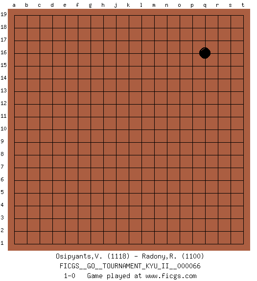 Last move : 1-0 2018 February 20 2:46:18 [Event "FICGS__GO__TOURNAMENT_KYU_II__000066"] [Site "FICGS"] [Date "2018.01.20"] [Round "1"] [Black "Osipyants,Vladimir"] [White "Radony,Robert"] [Result "1-0"] [Rating 1 "1118"] [Rating 2 "1100"] 1.q16 1-0 This go game has been lost on time (started : 2018.01.20 20:33:57) Here are the names of the openings (joseki) played in the four corners : Player Black won this Go (weiqi, baduk) game. Follow this game move after move (download)Ikken tobi is never wrong. (Anonymous) Political correctness is subjecting us to gross incompetence. (Johann Piek)