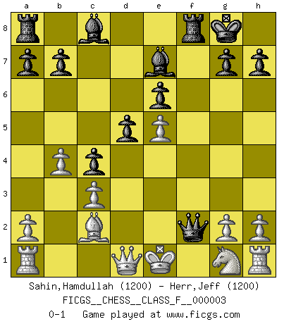 Last move : 0-1 2006 July 17 13:59:43 [Event "FICGS__CHESS__CLASS_F__000003"] [Site "FICGS"] [Date "2006.06.01"] [Round "1"] [White "Sahin,Hamdullah"] [Black "Herr,Jeff"] [Result "0-1"] [WhiteElo "1200"] [BlackElo "1200"] 1.d4 d5 2.e3 c5 3.c3 e6 4.Nf3 Nf6 5.Bd3 c4 6.Bc2 Bd6 7.Nbd2 Nc6 8.e4 Nd7 9.e5 Be7 10.Ng1 O-O 11.Ndf3 f6 12.Bf4 fxe5 13.Bxe5 Ncxe5 14.Nxe5 Nxe5 15.dxe5 Qb6 16.b4 Qxf2+ 0-1 Queen's pawn game Kingside Castling by player Black (move 10) Player Black won this chess game. Follow this game move after move (download)When you don't know what to do, wait for your opponent to get an idea - it's sure to be wrong. (Tarrasch) Auf jeden Fall musst du zuerst Rechtsanwalt werden, damit du deine eigenen Interessen und die deiner Familie vertreten kannst. [Brief an seinen Sohn] (José Raúl Capablanca) Si el ingenio solamente fuese necesario para lucirse, las mujeres serían las mejores jugadoras de Ajedrez del mundo. (Albin) Fischer est le meilleur joueur du monde et Karpov n'est qu'un joueur de bistrot. (Garry Kasparov, agé de 16 ans) Patience, use the Force, think ! (Obi-Wan Kenobi in Star Wars ep.2)