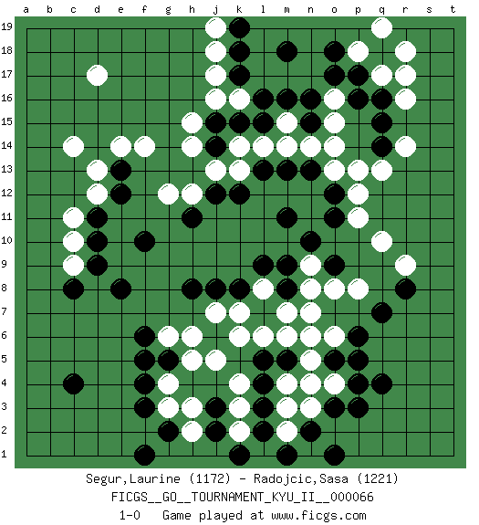 Last move : 1-0 2018 June 6 1:5:14 [Event "FICGS__GO__TOURNAMENT_KYU_II__000066"] [Site "FICGS"] [Date "2018.01.20"] [Round "1"] [Black "Segur,Laurine"] [White "Radojcic,Sasa"] [Result "1-0"] [Rating 1 "1172"] [Rating 2 "1221"] 1.q4 d17 2.c4 r16 3.p17 q17 4.p16 c14 5.c8 k4 6.f3 n3 7.p3 q10 8.l16 j17 9.k17 j16 10.q18 r18 11.q16 r17 12.r8 r9 13.q7 c10 14.n15 q13 15.f6 h3 16.e8 p18 17.o18 q19 18.g2 h2 19.f10 h6 20.d11 c11 21.e13 e14 22.h8 f14 23.j14 h15 24.o12 o13 25.n13 o14 26.q14 n14 27.m13 m14 28.l13 k16 29.k18 j18 30.k19 j19 31.l15 o15 32.n16 o16 33.o17 r14 34.q15 p13 35.j6 j5 36.o5 m6 37.m5 k6 38.k8 j7 39.l7 l6 40.j8 m15 41.m16 l14 42.k15 k14 43.j15 k13 44.m11 p12 45.o11 p11 46.k12 j13 47.j12 h14 48.m18 h12 49.l3 m4 50.l4 n5 51.l5 m3 52.l2 o6 53.n2 m2 54.m1 o4 55.o3 n4 56.p5 n7 57.o9 g3 58.f1 d13 59.e12 d12 60.g5 h5 61.o1 g4 62.f4 k7 63.p4 n6 64.j3 k3 65.j2 g6 66.f5 k2 67.k1 l8 68.m8 m7 69.l9 n8 70.m9 n9 71.n10 p8 72.p6 o8 73.h11 g12 74.d10 c9 75.d9 1-0 This go game has been lost on time (started : 2018.01.20 20:33:57) Here are the names of the openings (joseki) played in the four corners : Corner q16 : r16 p17 Komoku (Somok, Xiao~mu`) 3-4 Point. The komoku (3-4) point is the traditional corner enclosure move.. Ikken Kakari (Hankan Keolch'im, Yi Gua`jiao~, 1-Space Low Pincer). The small knight move is the basic approach move to the 3-4 point stone. It has been continually used for over four centuries. There are limitless variations, with new moves constantly being discovered. Black 2 opens the door to a treaure store of joseki. Corner q4 : q4 n3 Hoshi (Hwajeom, Seongjeom, Xingwei`) 4-4 Point. The star or hoshi (4-4) point, emphasizing influence at the potential expense of territory. Niken Kakari (Dukan Keolch'im, E`r Gua`jiao~, 2-Space Low Approach). Black typically answers by 7-3 or 3-5 (which is not joseki). Player Black won this Go (weiqi, baduk) game. Follow this game move after move (download)Be a little patient. Keshi works ! (Anonymous) I fear not the man who has practiced 10,000 kicks once, but I fear the man who has practiced one kick 10,000 times. (Bruce Lee)
