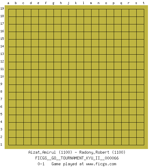 Last move : 0-1 2018 February 20 2:40:34 [Event "FICGS__GO__TOURNAMENT_KYU_II__000066"] [Site "FICGS"] [Date "2018.01.20"] [Round "1"] [Black "Aizat,Amirul"] [White "Radony,Robert"] [Result "0-1"] [Rating 1 "1100"] [Rating 2 "1100"] 0-1 This go game has been lost on time (started : 2018.01.20 20:33:57) Here are the names of the openings (joseki) played in the four corners : Player White won this Go (weiqi, baduk) game. Follow this game move after move (download)Keep sente in the opening. A premature attack loses sente. (Anonymous) I'm extremely disappointed. I send you out for exciting, new designer drugs, you come back with tomato sauce. (Gregory House, House M.D.)