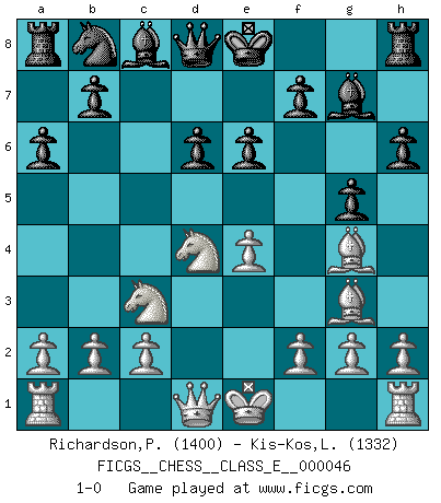 Last move : 1-0 2007 May 9 18:14:41 [Event "FICGS__CHESS__CLASS_E__000046"] [Site "FICGS"] [Date "2007.04.22"] [Round "1"] [White "Richardson,Patrick"] [Black "Kis-Kos,Laszlo"] [Result "1-0"] [WhiteElo "1400"] [BlackElo "1332"] 1.e4 c5 2.Nf3 d6 3.d4 cxd4 4.Nxd4 Nf6 5.Nc3 a6 6.Be3 Ng4 7.Bg5 h6 8.Bh4 g5 9.Bg3 Bg7 10.Be2 e6 11.Bxg4 1-0 Sicilian : Najdorf, Byrne (English) attack Player White won this chess game. Follow this game move after move (download)Only the player with the initiative has the right to attack. (Wilhelm Steinitz) Wie gewinnt Tal? Er entwickelt alle seine Figuren in die Brettmitte und opfert sie dann irgendwo. (Robert James Fischer) No volvere nunca a jugar contigo. Has insultado a mi amigo. - cuando un oponente se maldijo por una mala jugada (Miguel Najdorf) Ne tendez aucun piège pour le plaisir ! Ne jouez rien dans l'espoir que l'adversaire réagisse de façon stupide ! Prenez toujours pour acquis que l'adversaire va trouver le meilleur coup ! Ne jouez jamais de coup dans l'espoir que l'adversaire ne voie pas la menace ! Chacun de vos coups doit améliorer la position d'une façon ou d'une autre. Beta. Software undergoes beta testing shortly before it's released. Beta is latin for still doesn't work. (Anonymous)