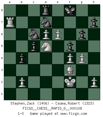 Last move : 1-0 2018 February 26 23:31:30 [Event "FICGS__CHESS__RAPID_D__000108"] [Site "FICGS"] [Date "2018.01.21"] [Round "1"] [White "Stephen,Zack"] [Black "Csoma,Robert"] [Result "1-0"] [WhiteElo "1406"] [BlackElo "1323"] 1.d4 Nf6 2.c4 c5 3.d5 e6 4.Nc3 exd5 5.cxd5 d6 6.Nf3 g6 7.Bf4 Bg7 8.Qa4+ Bd7 9.Qb3 Qc7 10.e4 O-O 11.Nd2 a6 12.a4 Bc8 13.Nc4 Rd8 14.Qb6 Qxb6 15.Nxb6 Ra7 16.Bxd6 Nbd7 17.Be7 Re8 18.Nxc8 Rxc8 19.f4 Re8 20.d6 Bf8 21.Bxf8 Kxf8 22.e5 Ng4 23.Be2 Ne3 24.Kf2 Nc2 25.Rac1 Nd4 26.Bg4 f5 27.Bf3 b5 28.axb5 axb5 29.Ra1 Rxa1 30.Rxa1 b4 31.Nd5 Rb8 32.Ra7 Rd8 33.g4 Nc6 34.e6 1-0 Benoni defense Kingside Castling by player Black (move 10) Player White won this chess game. Follow this game move after move (download)It is not enough to be a good player... you must also play well. (Siegbert Tarrasch) Irgendwie scheint mir sonntags früh um 9 Uhr der Killerinstinkt verloren gegangen zu sein. (Alexej Shirov) Cada Peón es una Reina en potencia. (James Mason) Il vaut toujours mieux jouer un plan faux de façon logique que de n'avoir pas de plan du tout. (Victor Kortchnoï) Some people are so afraid to die that they never begin to live. (Henry Van Dyke)