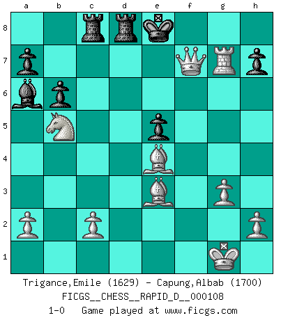 Last move : 1-0 2018 January 28 11:17:1 [Event "FICGS__CHESS__RAPID_D__000108"] [Site "FICGS"] [Date "2018.01.21"] [Round "1"] [White "Trigance,Emile"] [Black "Capung,Albab"] [Result "1-0"] [WhiteElo "1629"] [BlackElo "1700"] 1.e4 e6 2.d4 c5 3.Nf3 cxd4 4.Nxd4 Bc5 5.Nb3 Bb6 6.Be2 Qf6 7.O-O Ne7 8.Nc3 Nbc6 9.Nb5 Qe5 10.Nd6+ Kf8 11.Bf3 Bc7 12.g3 Bxd6 13.Bf4 Qxb2 14.Bxd6 Qf6 15.Ba3 b6 16.Rb1 Bb7 17.Bg2 Ne5 18.Bb2 d5 19.f4 N7c6 20.fxe5 Qg5 21.Qf3 Nxe5 22.Bxe5 f6 23.Nd4 dxe4 24.Qa3+ Kf7 25.Rb5 Kg6 26.Bf4 Qxb5 27.Nxb5 Rhd8 28.Qc1 e5 29.Be3 Ba6 30.Bxe4+ f5 31.Rxf5 Rac8 32.Rg5+ Kf6 33.Qf1+ Ke7 34.Rxg7+ Ke8 35.Qf7+ 1-0 French defense Kingside Castling by player White (move 7) Player White won this chess game. Follow this game move after move (download)I had a toothache during the first game. In the second game I had a headache. In the third game it was an attack of rheumatism. In the fourth game, I wasn't feeling well. And in the fifth game? Well, must one have to win every game ? (Siegbert Tarrasch) Wenn Du absolut nicht mehr weißt, was Du tun sollst, dann ist es Zeit für Panik. (John van der Wiel) La enorme capacidad mental, en la que sin ella no puede un jugador de Ajedrez existir, es demasiado requerida por el Ajedrez al grado de que nunca podrá liberar su mente de este juego. (Albert Einstein) Horreur, mais aussi harmonie suprême : qu'y avait-il en effet au monde en dehors des échecs ? Le brouillard, l'inconnu, le non-être... (Vladimir Nabokov) Lamb in skin of tiger, still fears the wolf. (Chinese proverb)