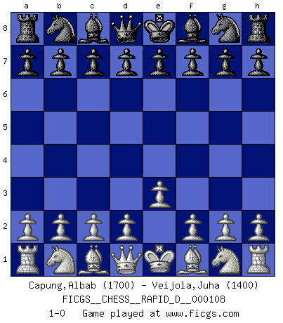 Last move : 1-0 2018 February 20 14:47:2 [Event "FICGS__CHESS__RAPID_D__000108"] [Site "FICGS"] [Date "2018.01.21"] [Round "1"] [White "Capung,Albab"] [Black "Veijola,Juha"] [Result "1-0"] [WhiteElo "1700"] [BlackElo "1400"] 1.e3 1-0 This chess game has been lost on time (started : 2018.01.21 0:15:20) Van't Kruijs Opening Player White won this chess game. Follow this game move after move (download)If Chess is a science, it's a most inexact one. If Chess is an art, it is too exacting to be seen as one. If Chess is a sport, it's too esoteric. If Chess is a game, it's too demanding to be just a game. If Chess is a mistress, she's a demanding one. If Chess is a passion, it's a rewarding one. If Chess is life, it's a sad one. (Unknown) Wenn Capablanka heute auf der Schachbühne erscheinen würde, hätte er ein halbes Jahr gebraucht um sich die Schachtheorie anzueignen. Und dann hätte er alles und jeden besiegt. (Mikhail Moiseyevich Botvinik) El jugador táctico debe saber que hacer cuando algo se debe de hacer. El estratégico debe saber que hacer cuando nada se debe de hacer. (Savielly Tartakover) Roi des jeux et jeu des rois, les échecs portent en eux un sentiment d'infini. Ils donnent à celui qui s'est efforcé d'en approfondir les arcanes l'impression de n'être pas à la mesure de l'homme; en fait, ils constituent un résumé de l'univers, un microcosme, et figurent cette grande échelle qui, dans les plans de la lumière descend jusqu'à la matière, qui des abîmes insondables remonte jusqu'en l'infini de Dieu. (Pyrame) There are two kinds of people in the world, my friend. Those who have a loaded gun and those who dig. You dig ! (Blondie in The Good, The Bad and The Ugly)
