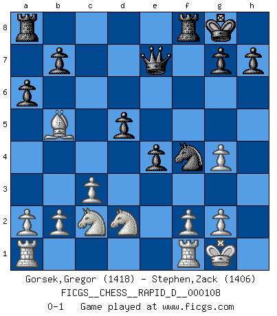 Last move : 0-1 2018 February 3 13:5:10 [Event "FICGS__CHESS__RAPID_D__000108"] [Site "FICGS"] [Date "2018.01.21"] [Round "1"] [White "Gorsek,Gregor"] [Black "Stephen,Zack"] [Result "0-1"] [WhiteElo "1418"] [BlackElo "1406"] 1.e4 c5 2.c3 Nf6 3.e5 Nd5 4.d4 cxd4 5.Qxd4 e6 6.Nf3 Nc6 7.Qe4 f5 8.exf6 Nxf6 9.Qh4 e5 10.Bg5 Be7 11.Nbd2 d5 12.Bb5 O-O 13.O-O e4 14.Ne1 Ne5 15.Qg3 Neg4 16.h3 Nh5 17.Bxe7 Qxe7 18.Qxg4 Bxg4 19.hxg4 Nf4 20.Nc2 a6 0-1 Sicilian : Alapin's variation (2.c3) Kingside Castling by player Black (move 12) Kingside Castling by player White (move 13) Player Black won this chess game. Follow this game move after move (download)We must make sure that Chess will not be like a dead language, very interesting, but for a very small group. (Sytze Faber) Den Ruhm habe ich schon, jetzt brauche ich noch das Geld. (Wilhelm Steinitz) El Ajedrez es el gimnasio de la mente. (Blaise Pascal) Le thème de l'attaque double intervient d'une manière ou d'une autre dans l'immense majorité des combinaisons. (Youri Averbakh) If I had no sense of humor, I would long ago have committed suicide. (Mahatma Gandhi)