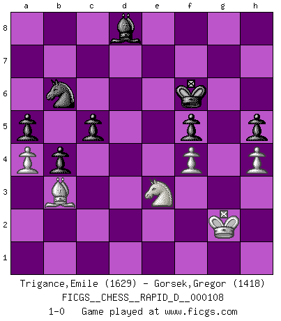 Last move : 1-0 2018 April 21 9:30:15 [Event "FICGS__CHESS__RAPID_D__000108"] [Site "FICGS"] [Date "2018.01.21"] [Round "1"] [White "Trigance,Emile"] [Black "Gorsek,Gregor"] [Result "1-0"] [WhiteElo "1629"] [BlackElo "1418"] 1.e4 g6 2.d4 Bg7 3.Nf3 d6 4.Bc4 Nf6 5.Qe2 O-O 6.O-O Bg4 7.c3 c6 8.Bb3 Nbd7 9.Nbd2 e5 10.h3 Bxf3 11.Nxf3 a5 12.a3 exd4 13.Nxd4 Qe7 14.Re1 Rae8 15.Bc2 d5 16.exd5 Qxe2 17.Rxe2 Nxd5 18.Kf1 Rxe2 19.Nxe2 Re8 20.Nf4 N5b6 21.Nd3 Nd5 22.Nf4 Nxc3 23.bxc3 Bxc3 24.Bb2 Bxb2 25.Rb1 Be5 26.Re1 Kf8 27.Nd3 Bd6 28.Rb1 b5 29.a4 b4 30.Re1 c5 31.Rxe8+ Kxe8 32.Bb3 Nb6 33.Nb2 Bc7 34.Ke2 Ke7 35.Kd3 f5 36.Nc4 Nd7 37.Ke3 Kf6 38.f4 h6 39.Kf3 g5 40.g3 h5 41.h4 gxf4 42.gxf4 Bd8 43.Kg3 Bc7 44.Kf3 Bd8 45.Ne3 Nb6 46.Kg2 1-0 This chess game has been lost on time (started : 2018.01.21 0:15:20) Robatsch (Modern) defense Kingside Castling by player Black (move 5) Kingside Castling by player White (move 6) Player White won this chess game. Follow this game move after move (download)A bad plan is better than none at all. (Frank Marshall) Dein Körper muss in Topform sein. Dein Schach verfällt, wenn dein Körper verfällt. Der Körper kann nicht vom Geist getrennt werden. (Robert James Fischer) Todo se encuentra en un estado de flujo y esto incluye al mundo del Ajedrez. (Mikhail Botvinnik) Un journaliste : 'Vous préférez avoir une dame de plus sur l'échiquier ou au lit ?' Boris Spassky : 'Ca dépend de la position.' If only people were all showed a certain minimum level of niceness; if only people didn't retract verbal draw offers (without draw box ticked) on ficgs; if only people didn't kill; if only people didn't run concentration / extermination camps, if only people didn't drop nuclear bombs on Hiroshima and Nagasaki, and so on - it would be a much more beautiful world. But sadly, things are not so... (Normajean Yates)