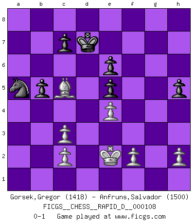 Last move : 0-1 2018 April 13 20:56:34 [Event "FICGS__CHESS__RAPID_D__000108"] [Site "FICGS"] [Date "2018.01.21"] [Round "1"] [White "Gorsek,Gregor"] [Black "Anfruns,Salvador"] [Result "0-1"] [WhiteElo "1418"] [BlackElo "1500"] 1.e4 e5 2.Nc3 Nf6 3.Bc4 Nc6 4.d3 Bb4 5.Nge2 d5 6.exd5 Nxd5 7.O-O Bxc3 8.Nxc3 Nxc3 9.bxc3 Kf8 10.Ba3+ Kg8 11.Qf3 Be6 12.Bxe6 fxe6 13.Rfe1 h5 14.Rab1 Rb8 15.Qh3 Qf6 16.Qe3 Qf5 17.Rb5 Rh6 18.Qe4 Qxe4 19.Rxe4 a6 20.Rb1 b5 21.Bc1 Rf6 22.Bg5 Rf5 23.Be3 Kf7 24.a4 Ke8 25.axb5 Rxb5 26.Rxb5 axb5 27.Kf1 Kd7 28.Ke2 Rf8 29.Rh4 g6 30.Re4 Ra8 31.g4 Ra4 32.gxh5 Rxe4 33.dxe4 gxh5 34.Bc5 Na5 0-1 This chess game has been lost on time (started : 2018.01.21 0:15:20) Vienna game Kingside Castling by player White (move 7) Player Black won this chess game. Follow this game move after move (download)A thorough understanding of the typical mating continuations makes the most complicated sacrificial combinations leading up to them not only not difficult, but almost a matter of course. (Siegbert Tarrasch) Charakterschwächen offenbaren sich normalerweise während einer Schachpartie. (Garry Kasparov) Me siento como si fuera una pieza en una partida de Ajedrez, cuando mi oponente me indica: esa pieza no puede ser movida. (Soren Kierkegaard) Ce qui caractérise les parties de combat, c'est que si le défenseur a constamment de difficiles problèmes à résoudre, l'attaquant doit chercher sans relâche de nouvelles possibilités d'attaque. (Koblentz) Lottery : A tax on people who are bad at math. (Author unknown)